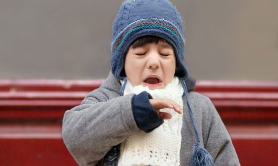 Outdoor portrait of sneezing boy